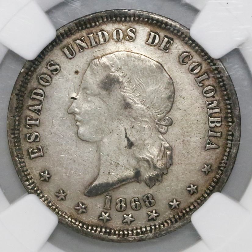 Bogota, Colombia, 5 decimos, 1868, NGC XF details / surface hairlines. Restrepo-293.1; KM-153.1. First date of issue, with good details despite weak strike (visible LIBERTAD in headband, for example), light hairlines and small mark on nose, nice luster with light gold toning. The "half dollars" of independent Colombia--a very popular series with collectors--effectively began with this date, for no prior coins of this size were struck after colonial times unless you include the unique and controversial LIBERTAD AMERICANA 4 reales of 1819. NGC #4216546-004.