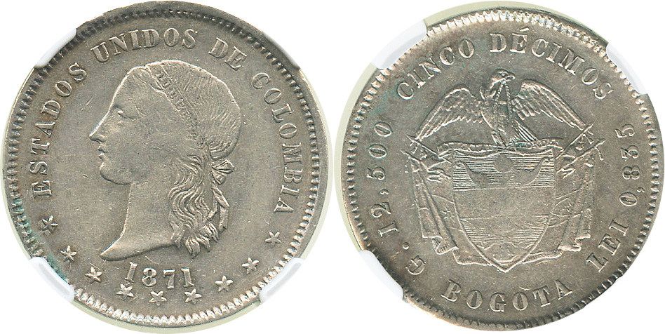 Bogota, Colombia, 5 decimos, 1871, encapsulated NGC XF 45. Restrepo-293.4; KM-153.1 Very lightly toned, no problems, the reverse exceptionally lustrous for the stated grade.