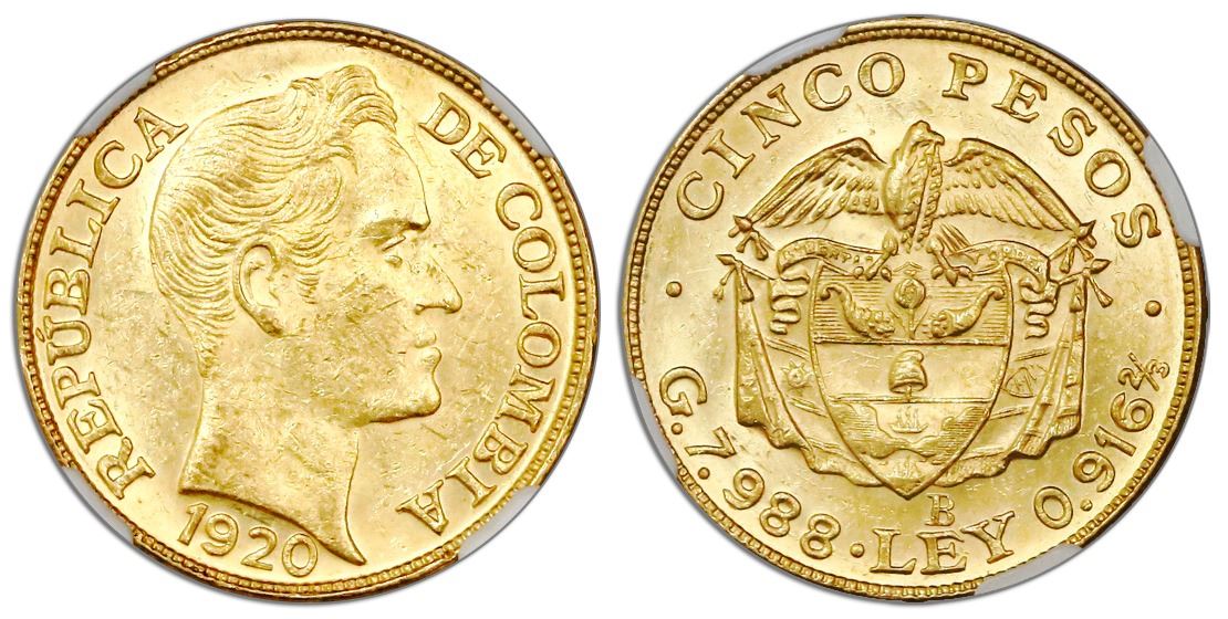 Bogota, Colombia, 5 pesos, 1920-B, NGC MS 62, ex-Dr. Frank Sedwick (stated on label).