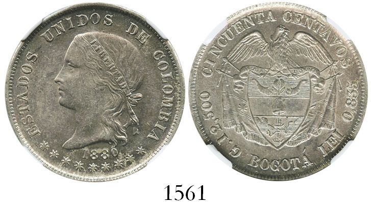 Bogota, Colombia, 50 centavos, 1880, encapsulated NGC AU 58. Restrepo-308.8; KM-177.1. Choice strike and highly lustrous, fully Mint State in our opinion.