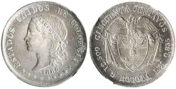 Bogota, Colombia, 50 centavos, 1880, encapsulated NGC MS 64, finest known graded by NGC.