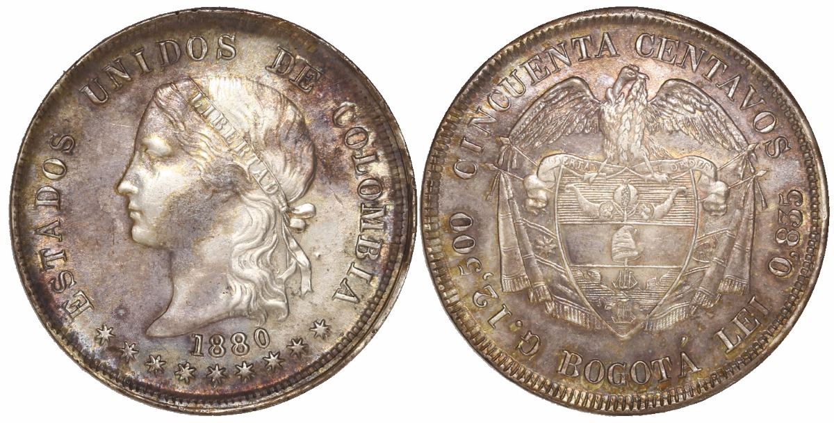 Bogota, Colombia, 50 centavos, 1880. 11.91 grams. Lustrous AU with uneven but colorful toning, an ideal comparison for the special Popayan version in the previous lot. Acquired from Alvaro Gonzalez, ca. 1973-1975.