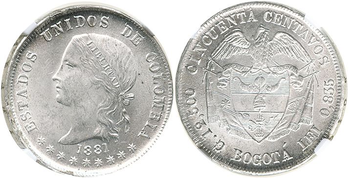 Bogota, Colombia, 50 centavos, 1881, encapsulated NGC MS 64, tied (with next lot) for finest known g
