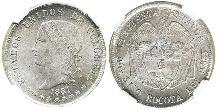 Bogota, Colombia, 50 centavos, 1881, encapsulated NGC MS 64, tied (with previous lot) for finest kno