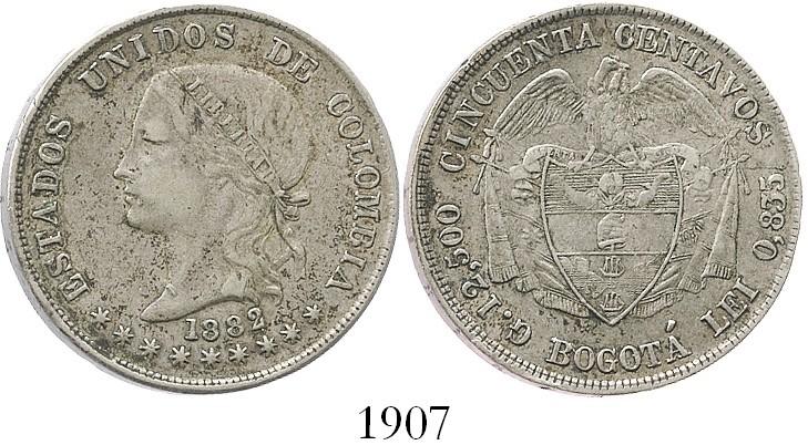 Bogota, Colombia, 50 centavos, 1882. R-308.11; KM-177.1. 12.3 grams. Nice VF+, lightly toned. Pedigreed to the Herman Blanton collection.