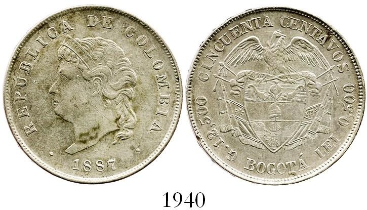 Bogota, Colombia, 50 centavos, 1887, "Cocobola," 2/2 in 12,500. R-405.1a; KM-185. 12.3 grams. Lightly cleaned XF with faint toning, a few minor marks and tiny edge-ding, scarce 2-year bust in a popular series. Pedigreed to the Herman Blanton collection.