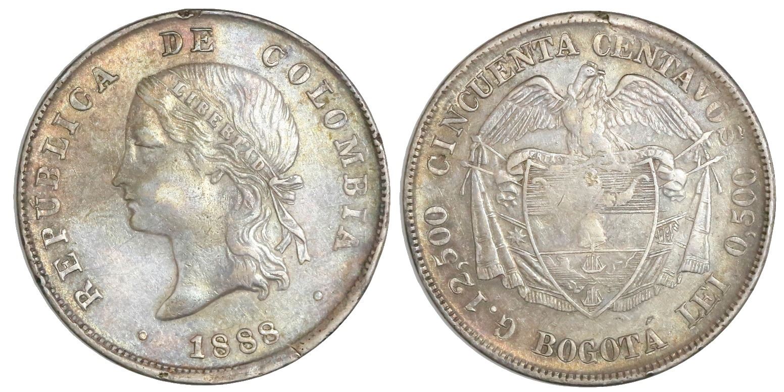 Bogota, Colombia, 50 centavos, 1888, ex-Richard Stuart, ex-Howard Herz.