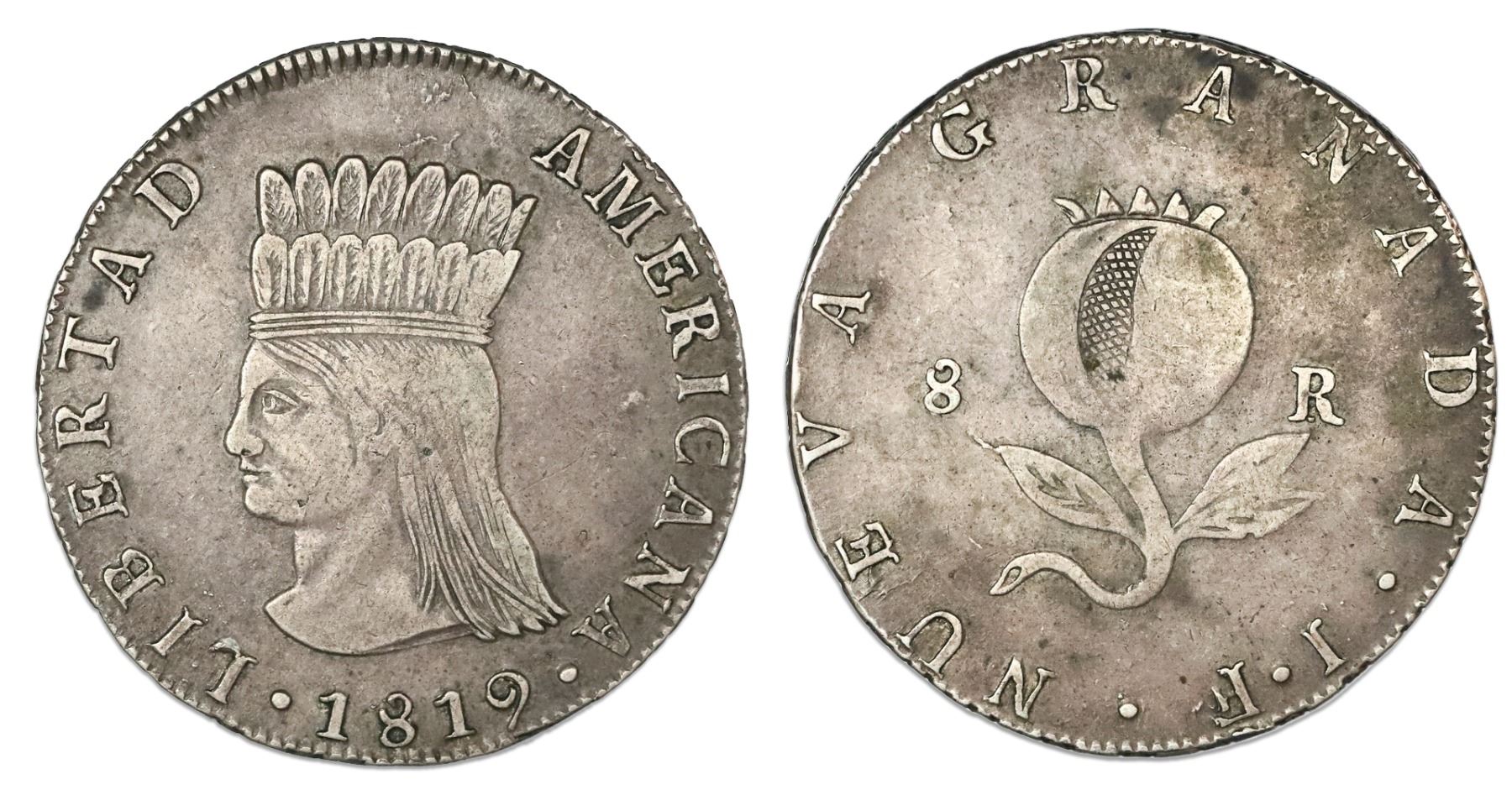 Bogota, Colombia, 8 reales, 1819JF, "Libertad Americana," PCGS XF40. Restrepo-142.1; KM-78. Choice full central details (rare thus) with deep toning all over, the ample fields largely unblemished, scarce and desirable first "crown" of independent Colombia. PCGS #39227525. Pedigreed to the Nueva Granada Collection (stated on label).