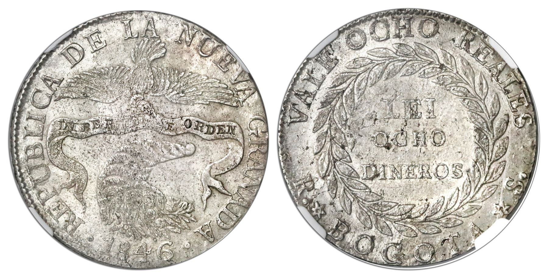 Bogota, Colombia, 8 reales, 1846RS, NGC MS 62. Restrepo-194.15; KM-98. Lustrous in legends, the surfaces slightly grainy (as made) and with weak rims as usual, nevertheless tied with two others for second finest in NGC census behind a single MS 63. NGC #3827625-009.