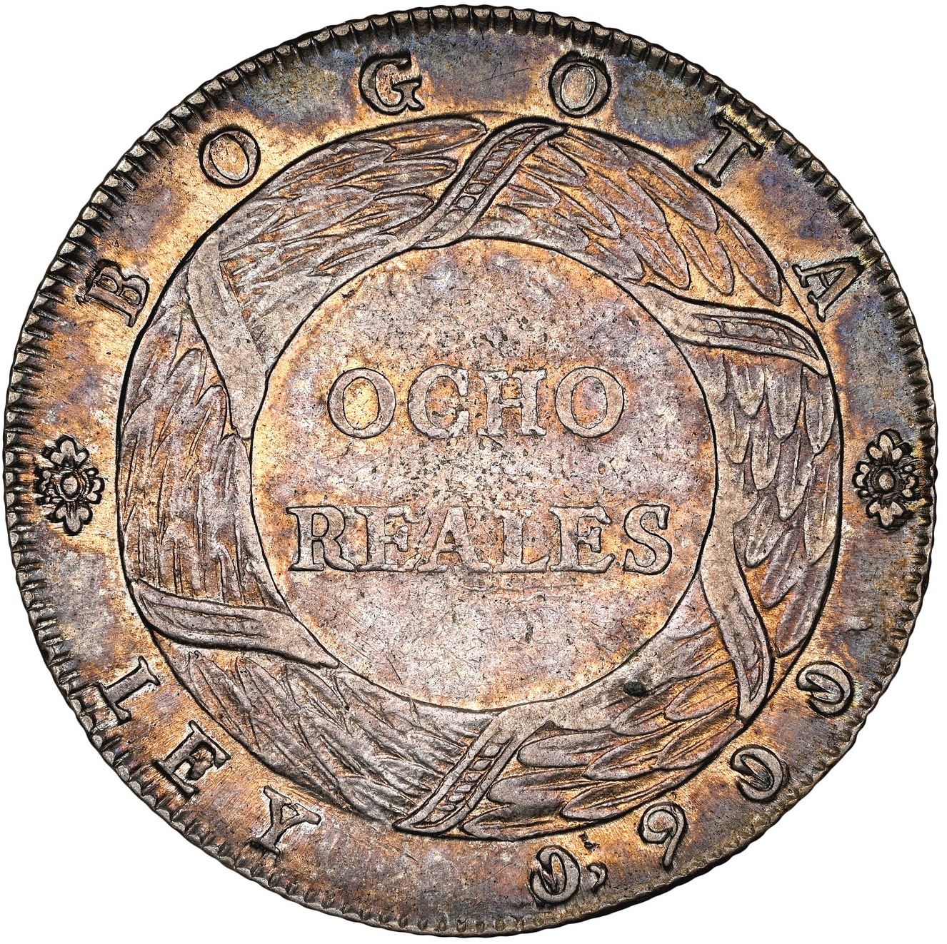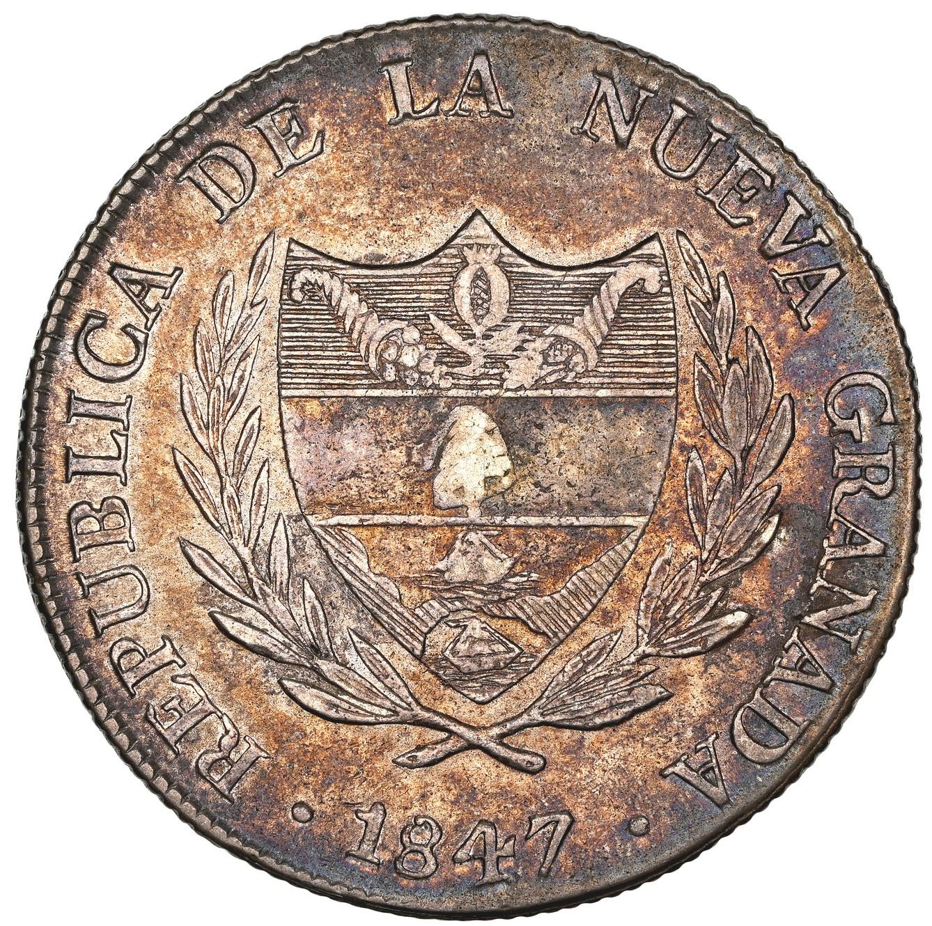 Bogota, Colombia, 8 reales, 1847, small diameter, NGC AU 53. Restrepo-195.1; KM-106. Deeply rainbow toned over luster, scarce one-year issue in higher-fineness silver but smaller size that replaced the condor-over-cornucopia type (previous lot) before beginning the new 10 reales (next lot).