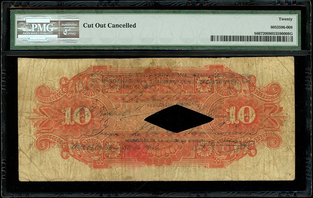Bogota, Colombia, Banco Nacional, 10 pesos, 30-10-1899 overprint on Bogota, Colombia, Banco de la Union, 10 pesos, 1-1-1883, series B, serial 3932, PMG VF 20. SCWPM-S862; DP-8876.1. Banco Nacional overprint of 1899 on 1883-dated Banco de la Union 10 pesos (SCWPM-S682). Scarce issue generally found well circulated, this one with a diamond cut cancellation (as noted by PMG), otherwise no problems beyond the usual circulation wear and soiling. PMG #8053596-008.