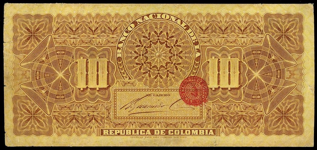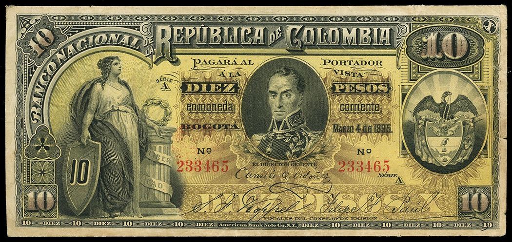 Bogota, Colombia, Banco Nacional, 10 pesos, 4-3-1895, series A, serial 233465. SCWPM-236a; CHPM-188. VF with a few edge splits in the right margin, very bold ink colors on both sides.