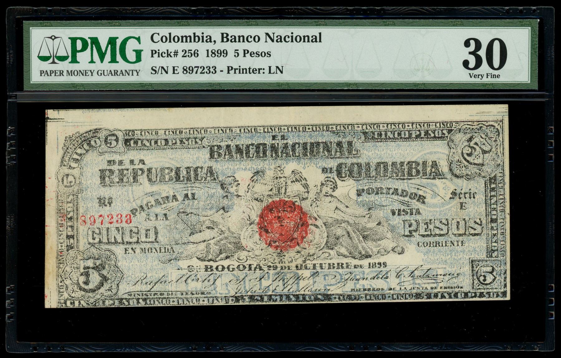 Bogota, Colombia, Banco Nacional, 5 pesos, 28-10-1899, series E, serial 897233, PMG VF 30. SCWPM-255; DP-222. Printed by the Litografia Nacional as part of the third and final emission. Crude printing with inconsistent ink color yet all details fully visible, nice note with a few light stains but no major problems.