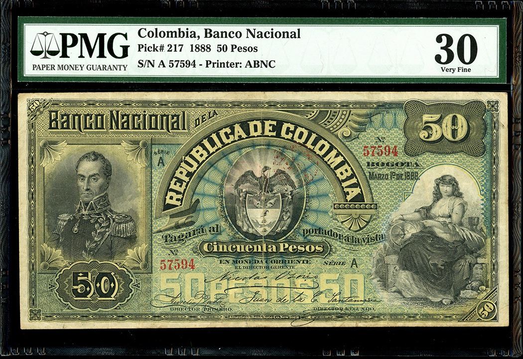 Bogota, Colombia, Banco Nacional, 50 pesos, 1-3-1888, series A, serial 57594, PMG VF 30. SCWPM-217a; CHPM-168. Large, high-denomination Colombian note with bold blue-green obverse and blue-yellow reverse colors, decent margins. Small pinhole in bottom left corner, otherwise quite nice and extremely rare to see on the market in this state. PMG #8039402-010.