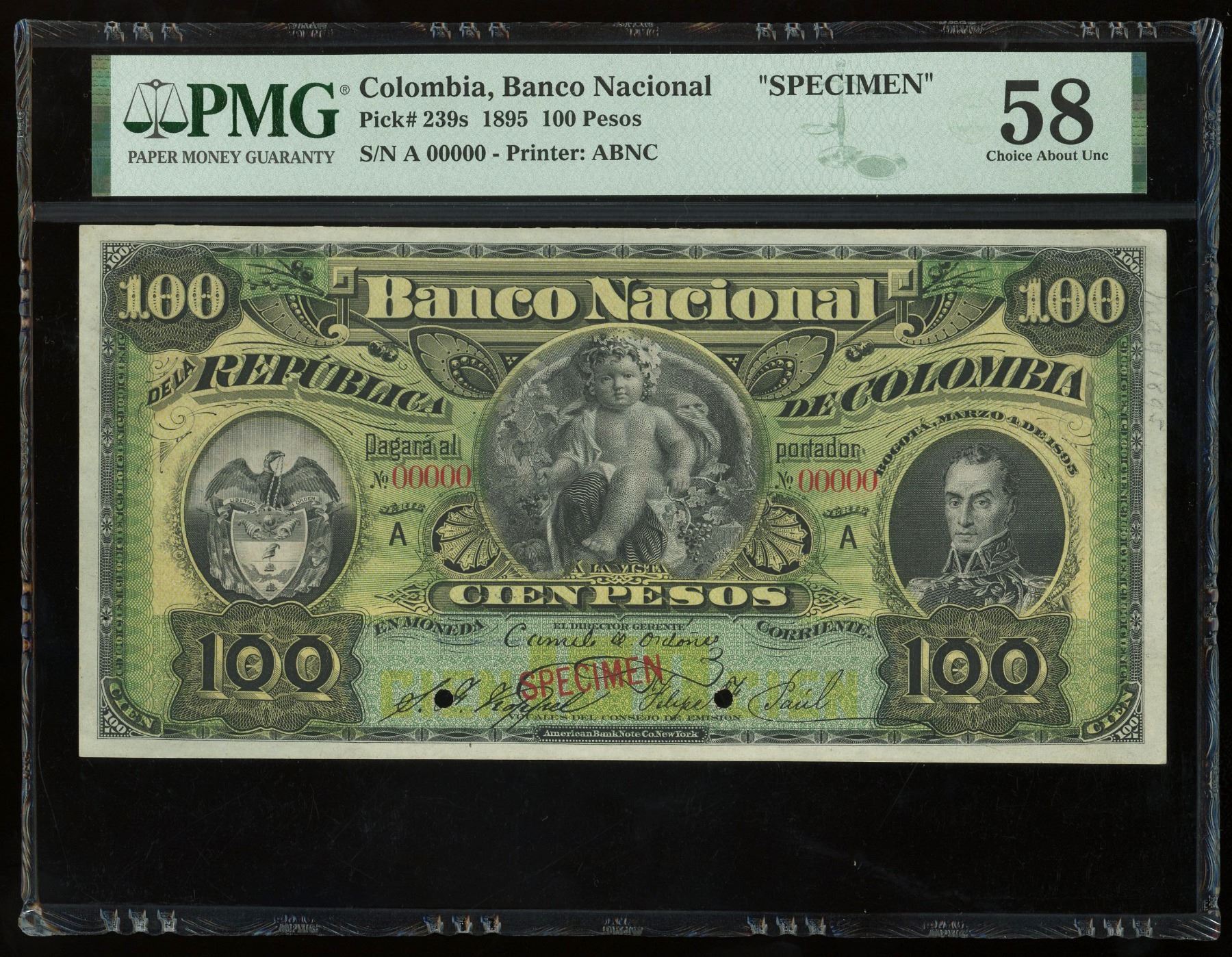 Bogota, Colombia, Banco Nacional de la Republica, 100 pesos specimen, 4-3-1895, series A, PMG Choice AU 58, "top pop." SCWPM-239s; CHPM-191. Tied with one other for finest known in the PMG census. Final date of issuance for the type with two punch hole cancellations. Vivid ink colors and nice paper quality; only two pinholes and penciled printer's annotation in margin to note. Please use this link to verify the certification number