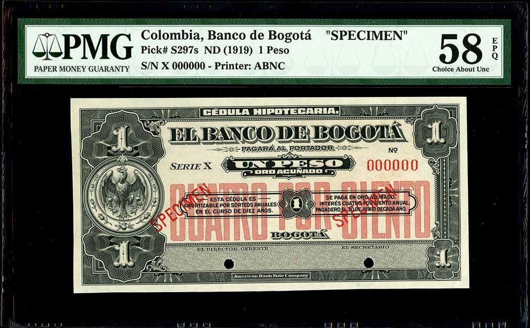 Bogota, Colombia, Banco de Bogota, 1 peso specimen, no date (1919), series X, PMG Choice AU 58 EPQ. SCWPM-S297s; CHPM-6335. Two POCs. One of two finest known in the PMG census. Robust embossing and color quality, only faint handling seen. PMG #8059474-007.