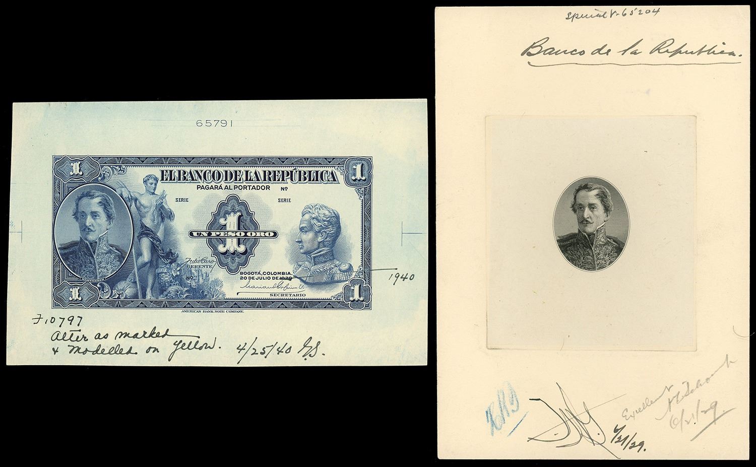 Bogota, Colombia, Banco de la Republica, 1 peso oro front essay, 1929, with proof vignette, ex-Eldorado. SCWPM-380p. Interesting front proof showing the transition from the peso design of 1929 (380a) to the 1940 issuance (380b) with ABNCo penned alteration and request for models dated to April 25, 1940. Accompanied by a 1929-dated vignette of Santander as featured on the note. Pedigreed to the Eldorado collection.