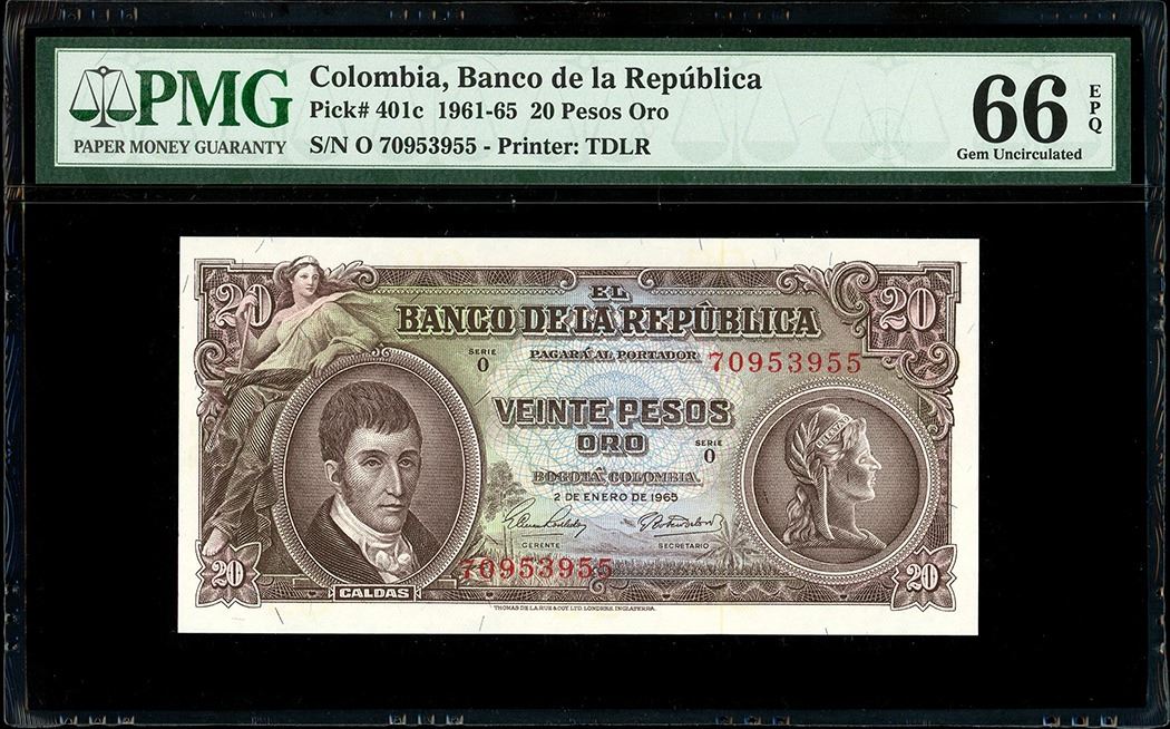 Bogota, Colombia, Banco de la Republica, 20 pesos oro, 2-1-1965, series O, serial 70953955. SCWPM-401c. Choice, original paper, excellent centering, and bold ink colors on this nicely designed note. PMG #8067298-001.