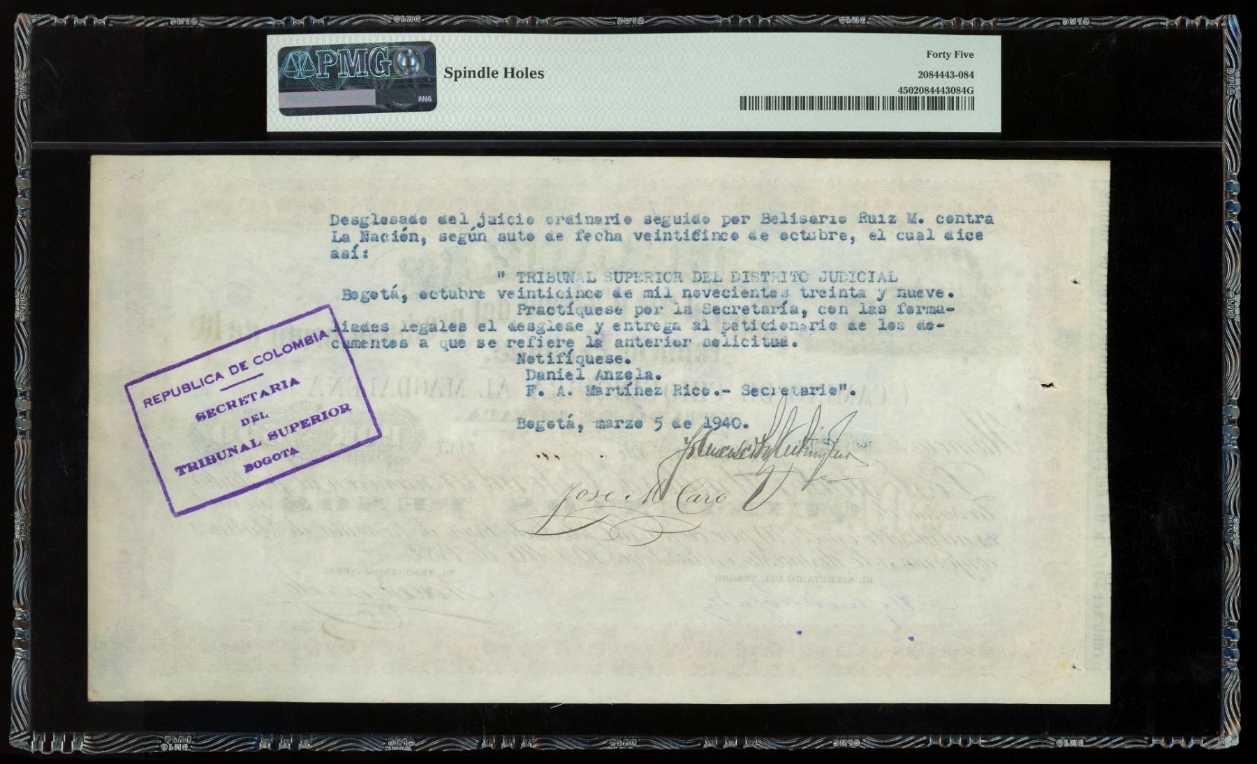 Bogota, Colombia, Camino de Chiquinquira al Magalena, 500 pesos, 24-10-1883, serial 00129, PMG Choice XF 45. SCWPM-unlisted; CHPM-2965. Very large note and the only denomination issued for this railway between Chiquinquira, Boyaca and Magdelena, Bogota; quite rare with no notable sales appearances in recent history. Choice quality for the assigned grade with only three spindle holes along left border. Please use this link to verify the certification number
