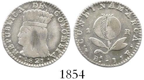 Bogota, Colombia (Cundinamarca), 1 real, 1821JF. R-152.1; KM-B9. 2.7 grams. Nice VF, richly toned and well struck. Pedigreed to the Herman Blanton collection.