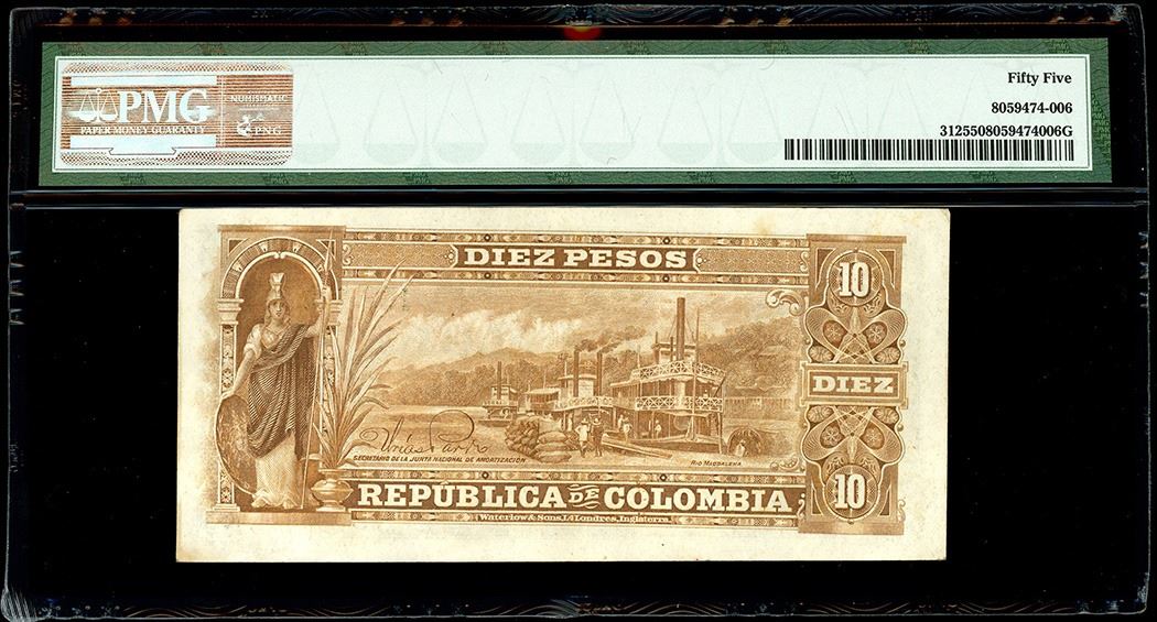 Bogota, Colombia, Republica de Colombia, 10 pesos, 1904, serial 1551245, PMG AU 55. SCWPM-312; CHPM-2678. One of two in AU 55 in the PMG census with only one higher at AU 58. Printed by Waterlow & Sons Limited of London. Quite nice with only faint circulation wear, vibrant red obverse underprint and subdued brown reverse color. PMG #8059474-006.