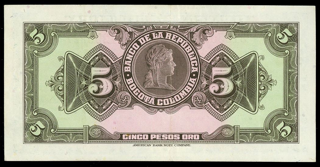 Bogota, Colombia, Republica de Colombia, 5 pesos oro, 20-7-1946, series M, serial 31250227. SCWPM-386c. XF with three light vertical folds, bold colors.