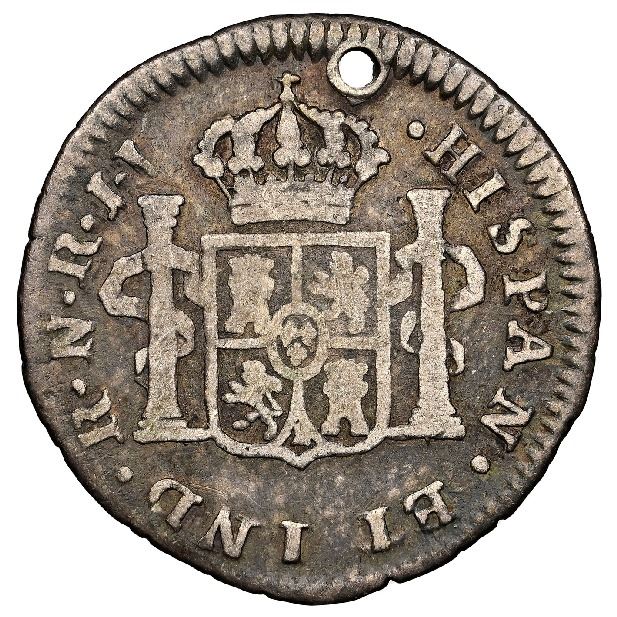 Bogota, Colombia, bust 1/2 real, Charles IV, 1793 J.J, unique, NGC VG details / holed, finest and only example in NGC census, ex-Ortiz Murias. Restrepo-77.2; Cal-322; KM-57. Deeply toned around the fully detailed legends, the centers lighter and quite weak (especially the bust), the reverse off-center, with tiny hole at top. Apparently when we sold this coin in Auction 11 the date was not singled out as any more than "rare" in Restrepo, but the 2012 version now says "one known," which agrees with our data and that of the consignor, who bought it in that sale. Pedigreed to the Gregorio Toulemonde Collection (stated on label) and to the Jorge Ortiz Murias Collection (Sedwick Auction 11, lot 1034).