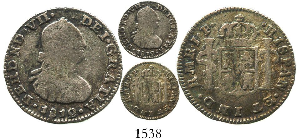 Bogota, Colombia, bust 1/2 real, Ferdinand VII (bust of Charles IV), 1812JF, mintmark as MR, rare. Restrepo-106.6; KM-69.1. 1.5 grams. Bold and deeply toned Fine with no problems, popular issue for the strange mintmark, which we suspect has something to do with "medio real" for denomination.