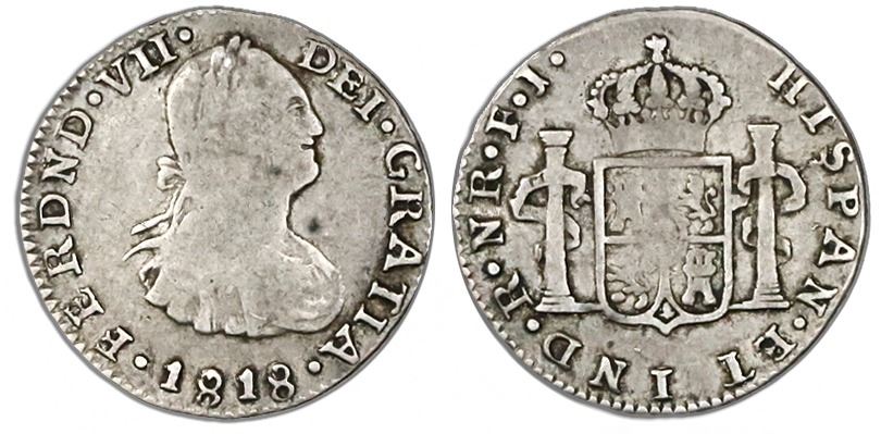 Bogota, Colombia, bust 1/2 real, Ferdinand VII (bust of Charles IV), 1818FJ. Restrepo-106.9; KM-69.1; CT-1386. 1.62 grams. AVF with weak centers, bold legends, weak rims as usual (as made). Pedigreed to our Auction #7 (lot #1340).