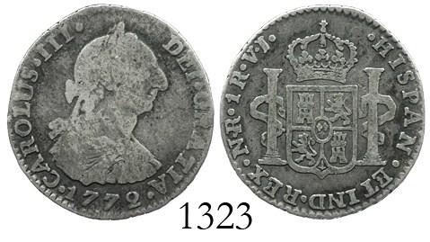 Bogota, Colombia, bust 1 real, Charles III, 1772VJ, rare. R-38.1. 3.0 grams. Typically crude F with weak rims but rich toning, desirable first date of issue.