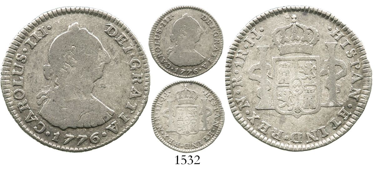 Bogota, Colombia, bust 1 real, Charles III, 1776JJ, rare, Plate Coin in Restrepo. Restrepo-38.7; KM-46.1. 3.4 grams. Popular date with US collectors, well-struck and problem-free Fine, important pedigree. Plate Coin on page 113 of the new English edition of Restrepo.