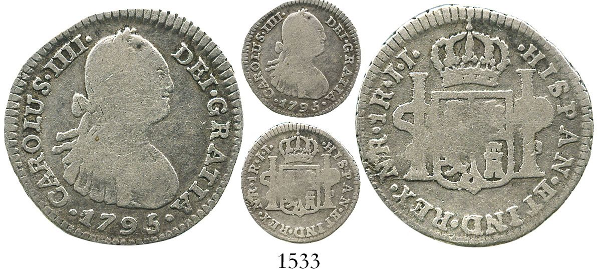 Bogota, Colombia, bust 1 real, Charles IV, 1795JJ, no dot in mintmark. Restrepo-78.12a; KM-58. 2.5 grams. Broad-flan Fine with weak centers, nicely toned near rims, no problems.