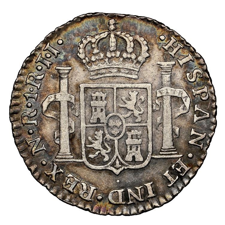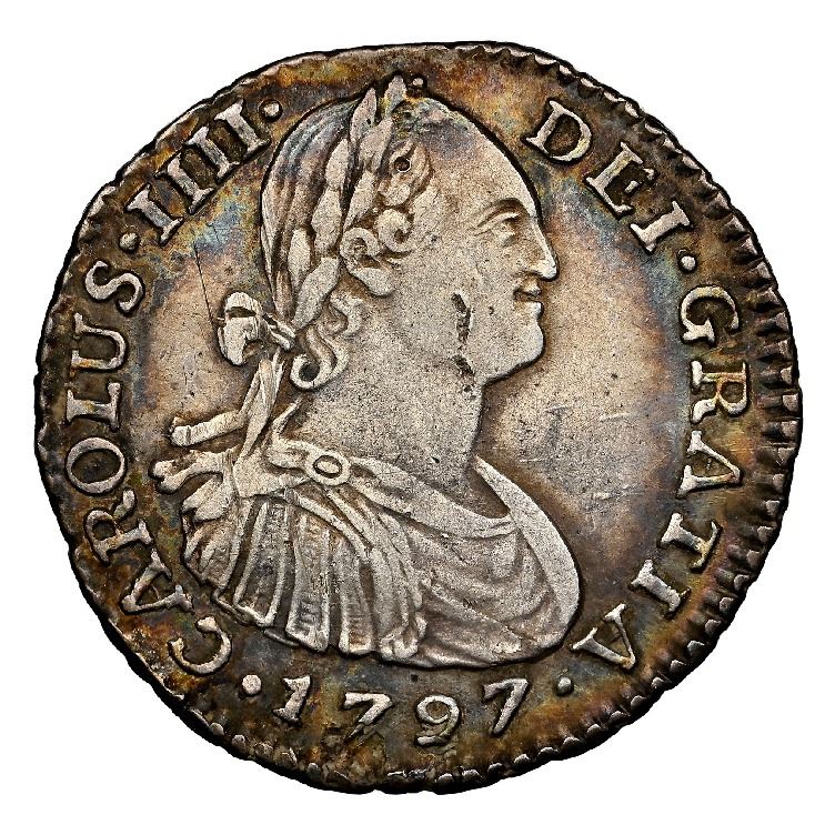 Bogota, Colombia, bust 1 real, Charles IV, 1797 J.J, NGC XF details / obv damage, finest and only example in NGC census, ex-Roberts. Restrepo-78.20; Cal-493; KM-58. Choice full details with deep toning in legends, rather nice all over except for a minor flaw in cheek and scuff mark towards the back of the head, otherwise a rare grade for this type. Pedigreed to the Gregorio Toulemonde Collection (stated on label) and to the Dana Roberts Collection (Heritage auction of April 2011, lot 25568).