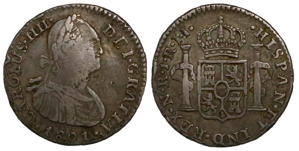 Bogota, Colombia, bust 1 real, Charles IV, 1801JJ. Restrepo-78.34; KM-58; CT-1192. 3.55 grams. VF+ with even wear, good toning, parts of rims crude.