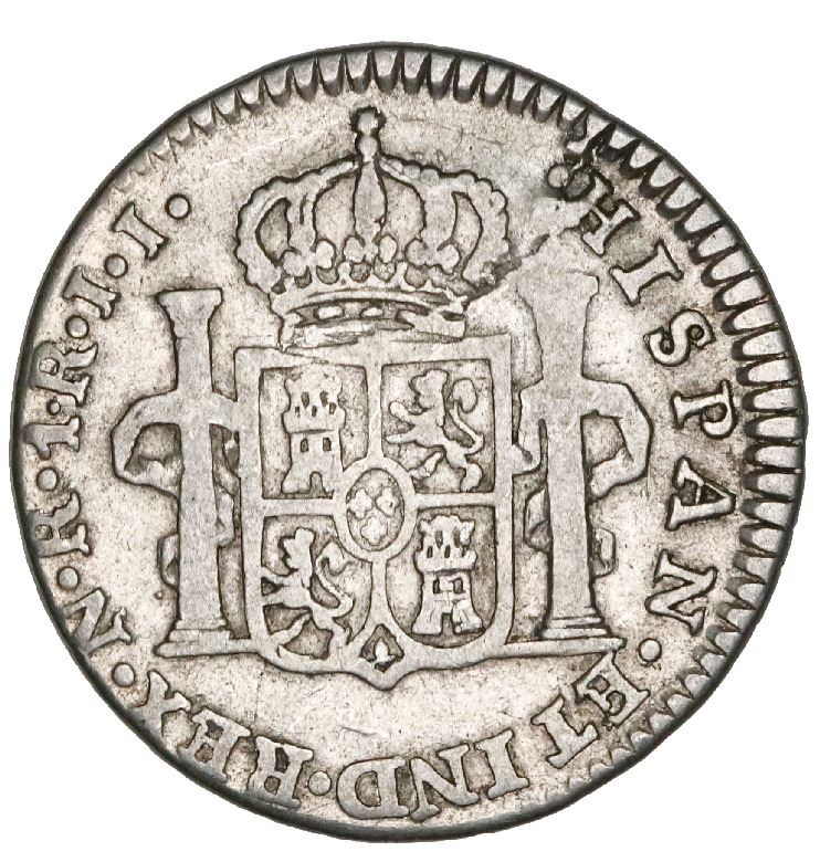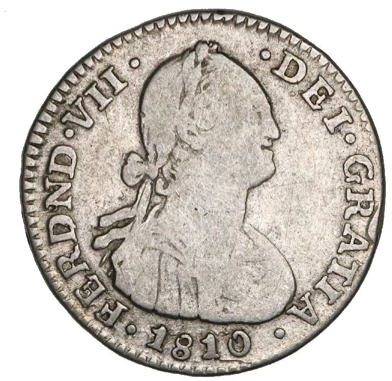 Bogota, Colombia, bust 1 real, Ferdinand VII (bust of Charles IV), 1810JJ, rare, NGC VG 8, finest known in NGC census. Restrepo-111.1; KM-68.1; Cal-649. Decent detail for the grade, with minimal toning (just around letters in legend) and light hairlines, die-crack on reverse, the finer of just two in the NGC census, first we have handled. NGC #5938639-029. Pedigreed to the Nueva Granada collection (stated on label).