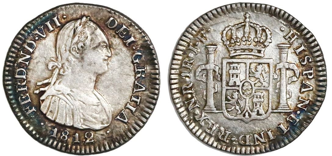 Bogota, Colombia, bust 1 real, Ferdinand VII (bust of Charles IV), 1812JF, ex-Gomez. Restrepo-111.5; KM-68.1; CT-1210. 3.26 grams. XF with vivid rainbow toning in legends, trace of luster, no problems and choice grade for the type. Pedigreed to the Arcelio Gomez collection.