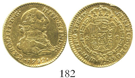 Bogota, Colombia, bust 2 escudos, Charles III, 1782/1JJ. Restrepo-62.21; KM-49.1; CT-unl. 6.7 grams. Bold AXF with small marks and bend in part of edge from mounting, scarce overdate.