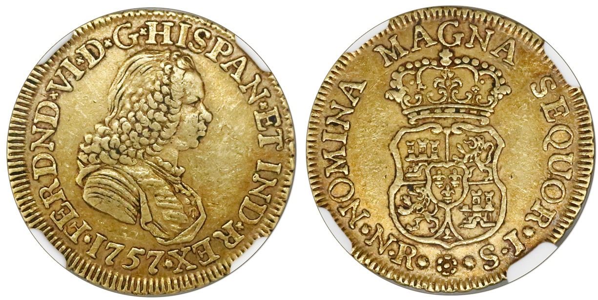 Bogota, Colombia, bust 2 escudos, Ferdinand VI, 1757SJ, rare, NGC AU 53. Restrepo-16.6; CT-130; KM-30.1. Nice, even details with light wear and attractive toning all over, seldom-seen double-assayer variety (listed in Restrepo as "rare") of a generally scarce early type, this specimen in fact being the only one graded so far by NGC. NGC #2823785-001.
