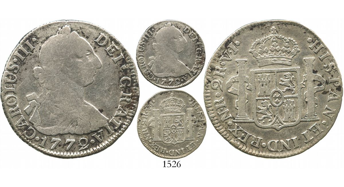 Bogota, Colombia, bust 2 reales, Charles III, 1772VJ, rare. Restrepo-42.2; KM-47. 6.9 grams. AVF with typically weak bust, spots of toning in legends, no problems.