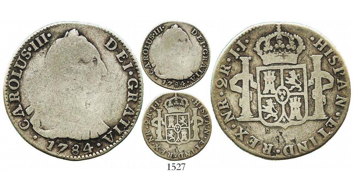 Bogota, Colombia, bust 2 reales, Charles III, 1784JJ, rare. Restrepo-42.10; KM-47. 6.5 grams. About Fine with very weak bust but bold legends, lightly toned all over but especially peripherally.