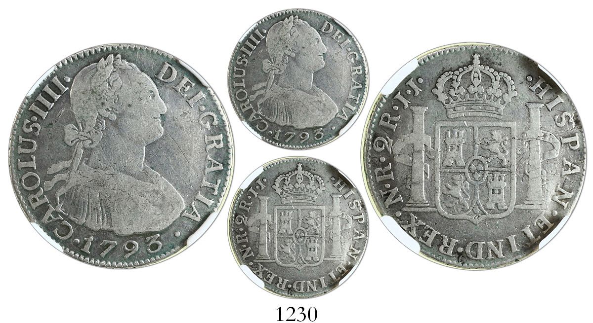 Bogota, Colombia, bust 2 reales, Charles IV, 1793JJ, encapsulated NGC F 12, very rare, ex-Ortiz Murias. Restrepo-80.3; KM-59; CT-1030. 6.6 grams. Lightly toned VF in our estimation, with minor stress-fractures in flan, a few light (old) scratches, much better than average grade for the type. Pedigreed to the Jorge Ortiz Murias collection (our Auction #11), lot #989.