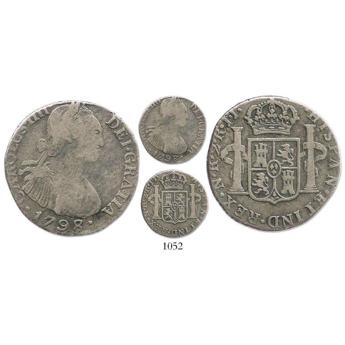 Bogota, Colombia, bust 2 reales, Charles IV, 1798/7JJ, plain edge, rare. R-80.9 (unlisted variety); KM-59. 6.5 grams. Undersized flan but essentially full weight, with no design applied to edge, lightly toned AVF for type.