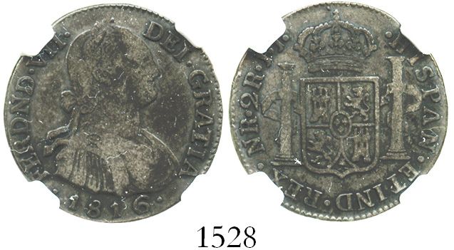 Bogota, Colombia, bust 2 reales, Ferdinand VII (bust of Charles IV), 1816FJ/JJ, rare. Restrepo-113.2; KM-70.1. Super-rich toning all over, with clear details that beg a higher grade (AVF in our opinion), choice for this issue in any case.