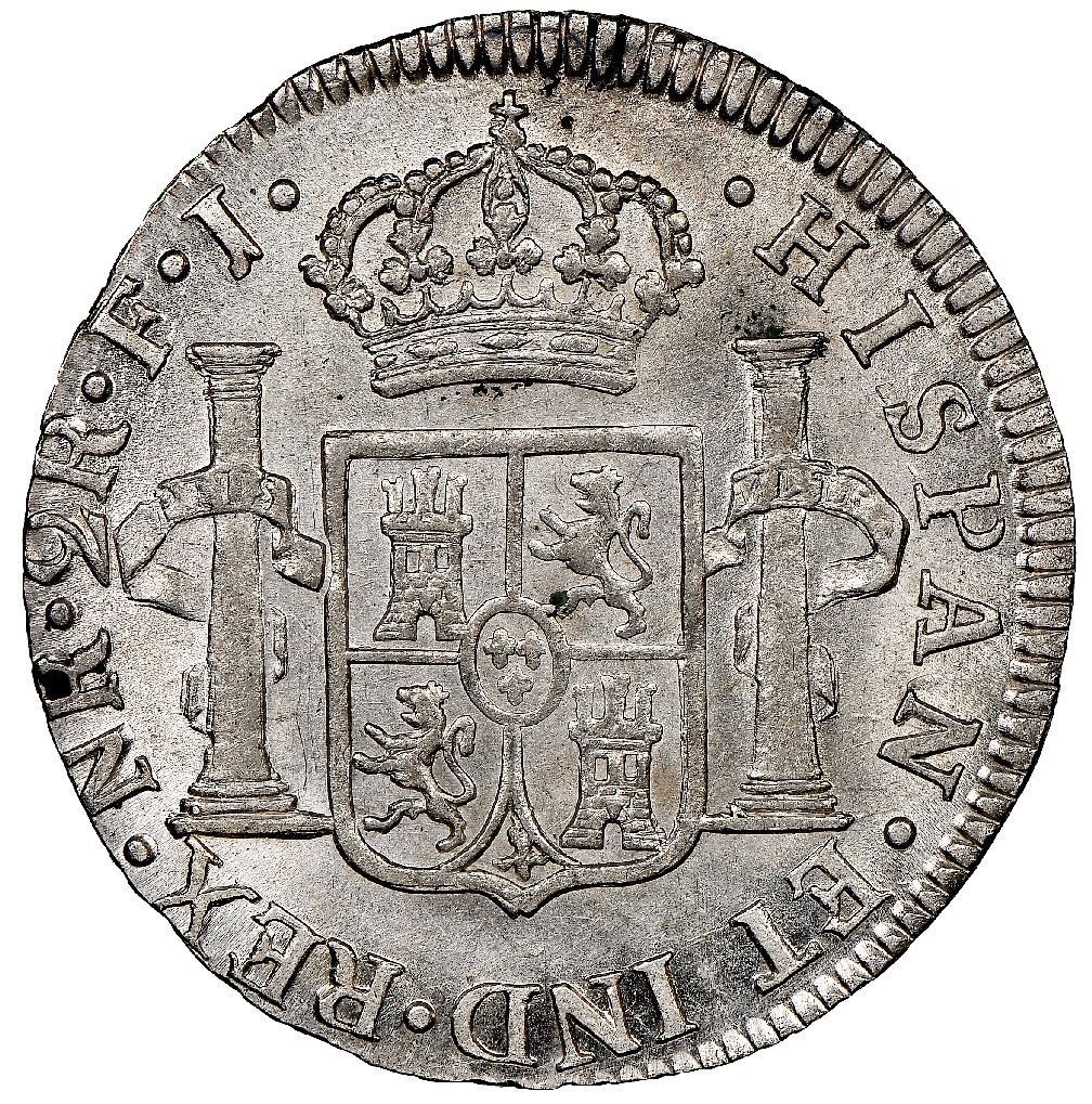 Bogota, Colombia, bust 2 reales, Ferdinand VII (bust of Charles IV), 1819FJ, NGC AU 58.