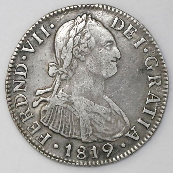 Bogota, Colombia, bust 2 reales, Ferdinand VII (bust of Charles IV), 1819FJ. Restrepo-113.7; KM-70.1; CT-1012. 6.76 grams. Lightly toned AXF for issue (scarce grade), very attractive. Pedigreed to our Auction #7, with original lot-tag #1319.