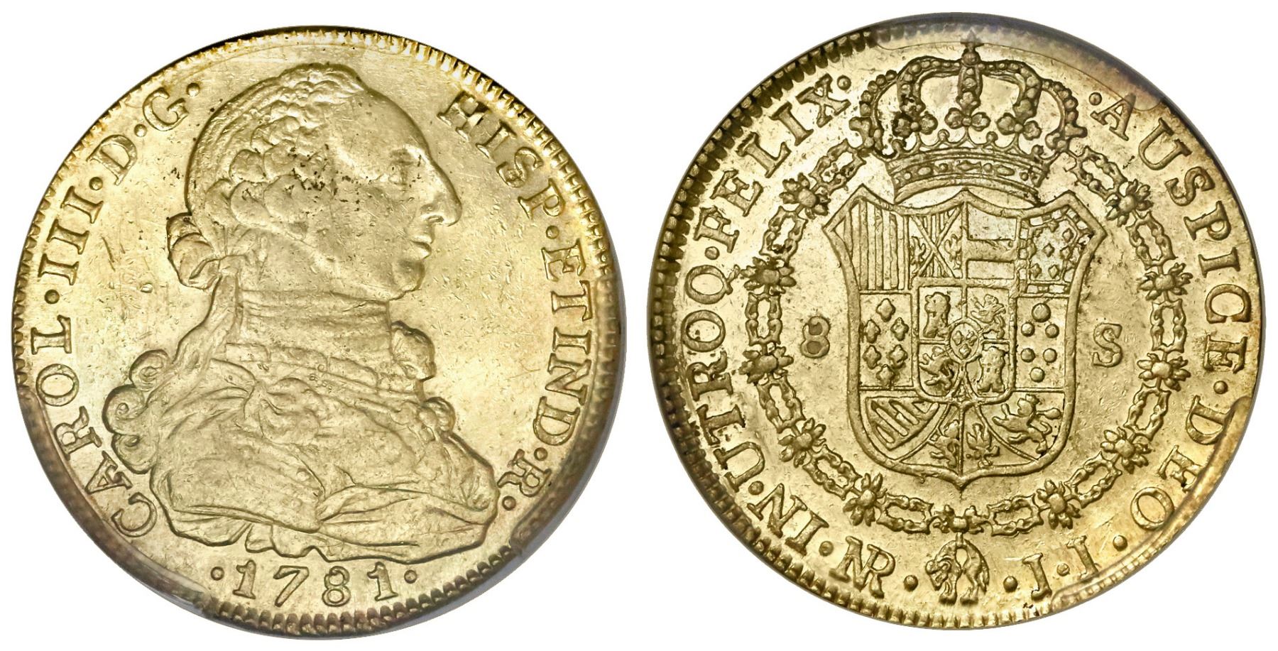 Bogota, Colombia, bust 8 escudos, Charles III, 1781JJ, PCGS AU50, ex-Young, ex-Eldorado. Restrepo-72.23; CT-189; KM-50.1. Lustrous and light yellow in color, with a modicum of handling marks but really closer to AU 55 or even 58 overall, in our opinion. Pedigreed to the Leo Young collection (RARCOA auction of May-June 1980, with original lot-tag #123) and to the Eldorado collection (Stack's Bowers auction of January 2018, lot #11200). PCGS #84987347.