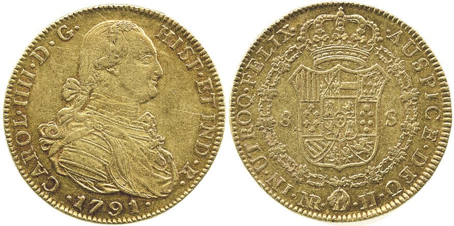 Bogota, Colombia, bust 8 escudos, Charles IV, 1791JJ, no dot between assayers. Restrepo-95.10b; CT-120; KM-62.1. 27.0 grams. Lustrous and well-struck AU with toning in legends, bagmarks in fields.