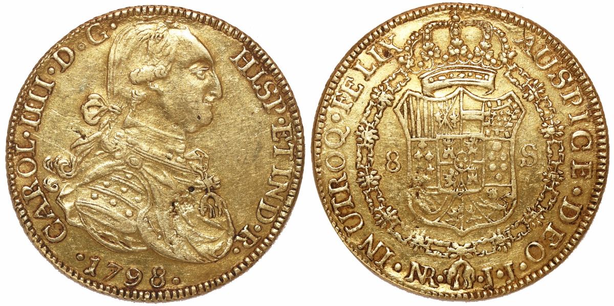 Bogota, Colombia, bust 8 escudos, Charles IV, 1798JJ, contemporary counterfeit made in gilt platinum. 26.99 grams. Bold XF with light toning, tiny voids here and there, the details clearly incorrect but very close.