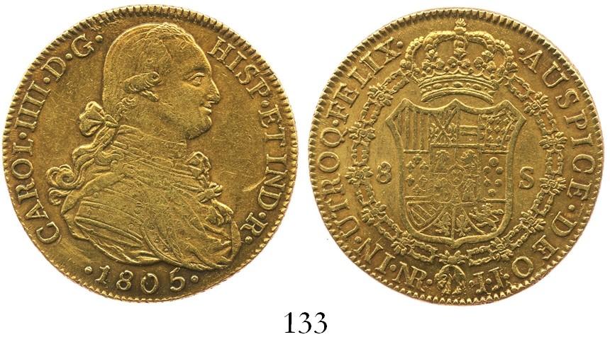 Bogota, Colombia, bust 8 escudos, Charles IV, 1805JJ. KM-62.1; CT-141. 27.1 grams. Choice XF with beautiful rich toning.