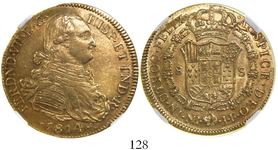 Bogota, Colombia, bust 8 escudos, Ferdinand VII (bust of Charles IV), 1814JF, encapsulated NGC AU 58. Restrepo-127.17; KM-66.1; CT-103. Lustrous and well detailed, just with minor flan-bulge and tiny laminations.